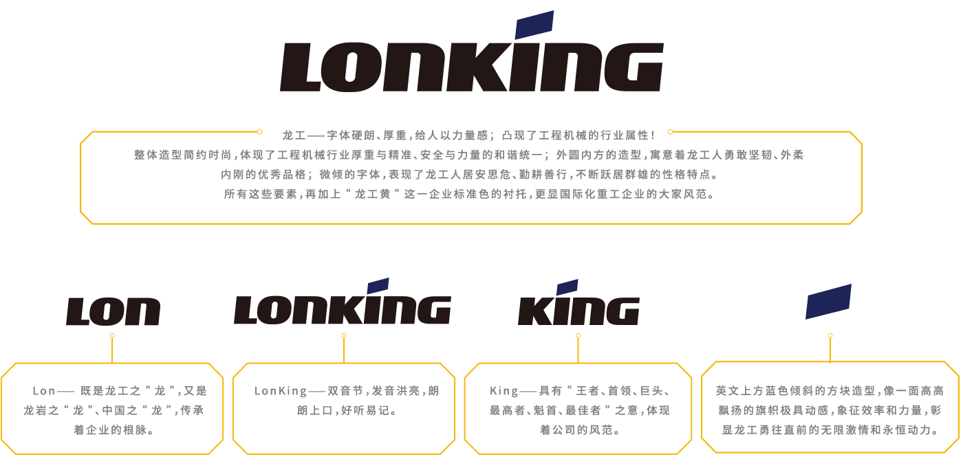 一是企業(yè)的視覺識別系統(tǒng),包括公司標(biāo)志、標(biāo)準(zhǔn)字、標(biāo)準(zhǔn)色等(詳見《龍工VI手冊》;